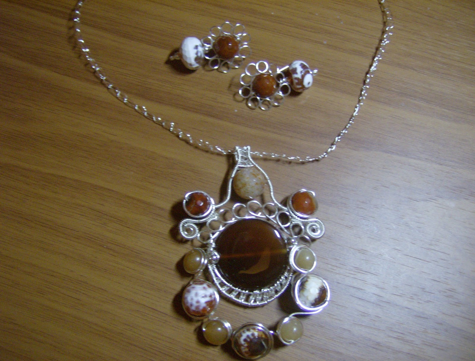 Colierul are ca piese de rezistenta doua pietre de carneol ovale , valurite de culoarea mierii poliflore