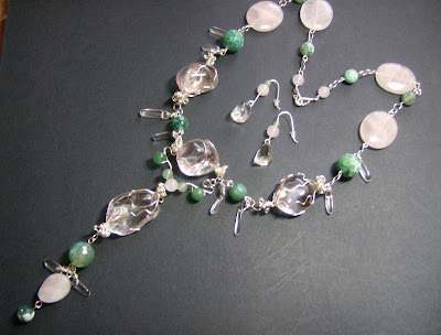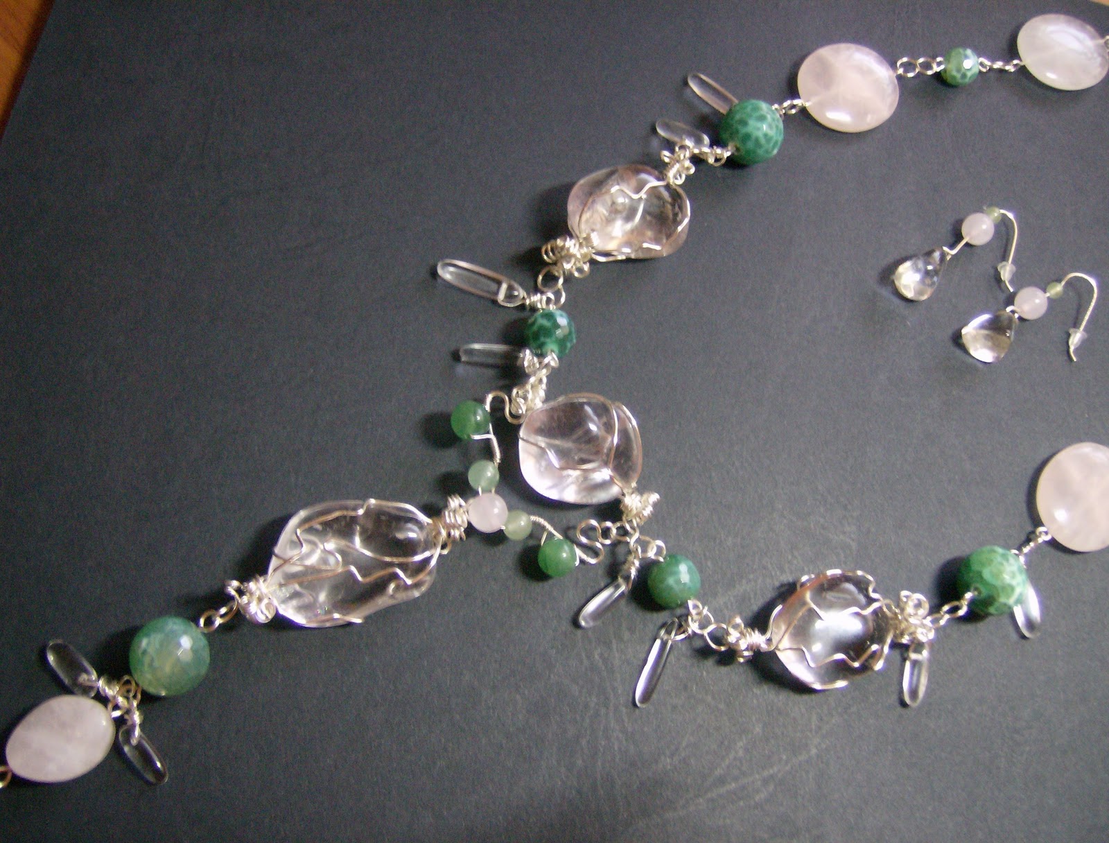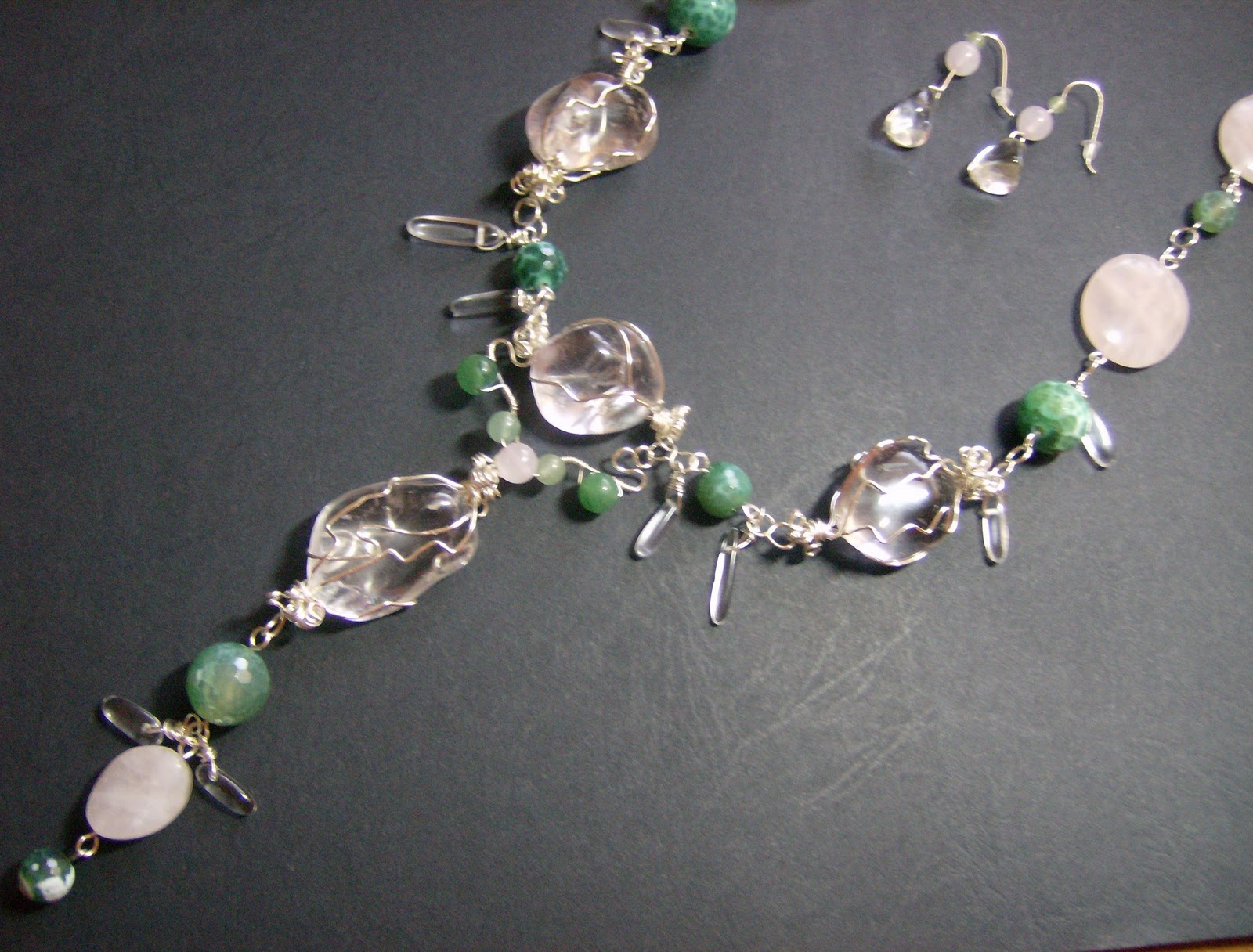 Set ,,Ice game" din semipretioase cristal de stanca, aventurin, cuart roz, fir argintat, agat cracle fire verde fatetat